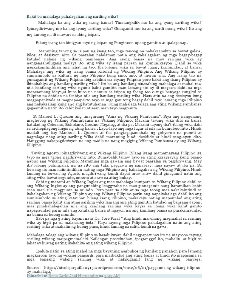Bakit Ba Mahalaga Pahalagahan Ang Sariling Wika Pdf