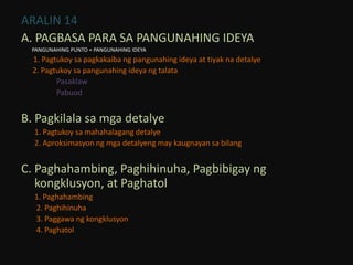 Buoin gamit ang mga talata ang mga pangunahing kaisipang taglay ng bawat bahagi ng sulatin. Ang salitang ideya ay may ibat ibang kahulugan na ito lahat ay depende sa kung paano ito ginagamit. Ano ang kahulugan ng elehiya at konsepto - Komunikasyon - 2022.