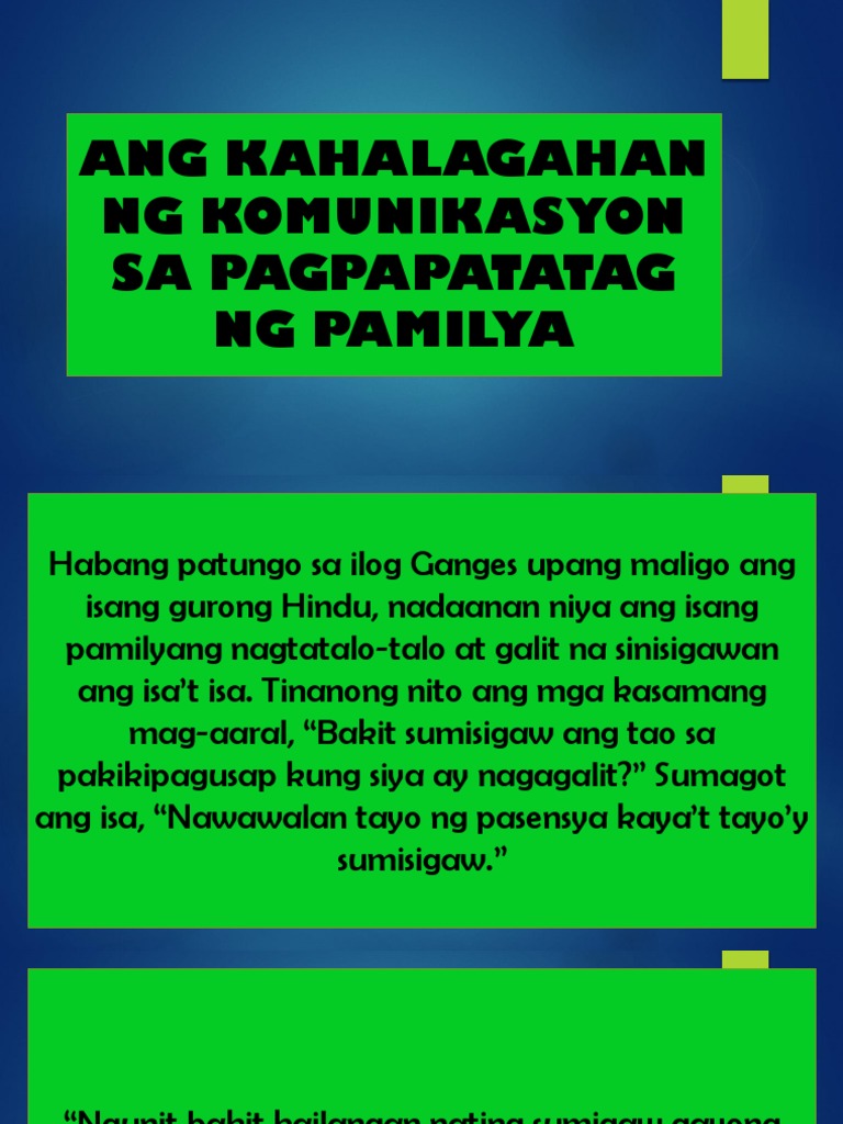 This preview shows page 75 - 87 out of 169 pages. Ang kahalagan ng pamilya ay mahalaga sapagkat dito nag uumpisa at dito hinuhubog ang isang pagkatao ng bawat isa. Ang berbal at di-berbal.