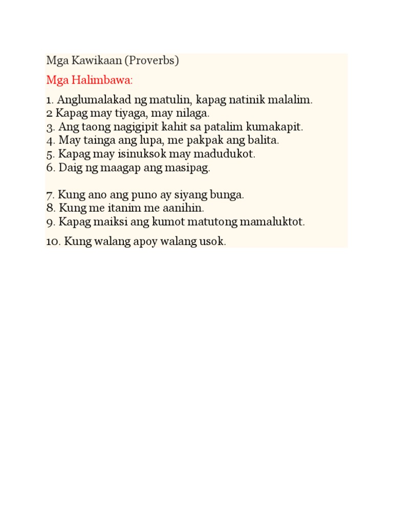 27062017 Ang sampung halimbawa ng salawikain. Sa katunayan maraming bata ang mahilig kabisahin ang mga ito. Pinoy Collection Maikling Kwento Mga Tula Bugtong atbp.