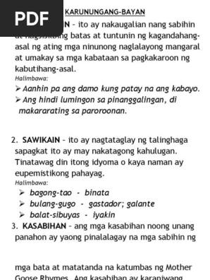 Salawikain Isang patalinghagang pahayag na ginagamit ng mga matatanda noong unang panahon upang mangaral at akayin ang mga kabataan sa mabuting asal. Sigurado ako na matutuwa ka sa mga gawain na. Ano ang kahalagahan ng kwentong bayan sa kultura ng isang bayan.